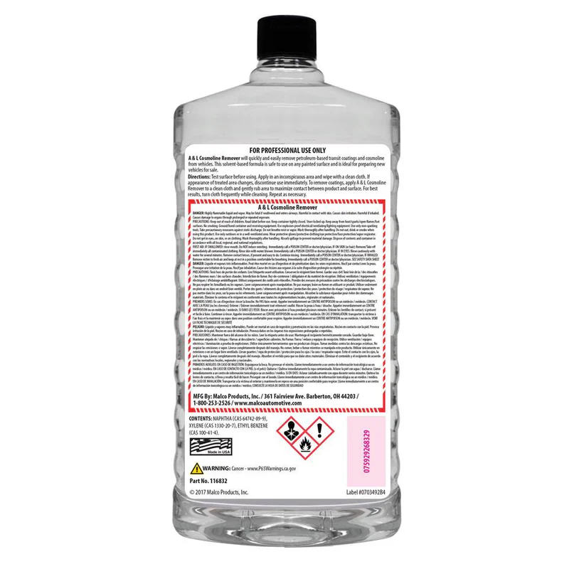El eliminador de cosmolina de A&L eliminará de manera rápida y sencilla los recubrimientos de tránsito a base de petróleo y la cosmolina de los vehículos. Esta fórmula a base de solvente es segura para usar en cualquier superficie pintada y es ideal para preparar vehículos nuevos para la venta. No suavizará, opacará ni decolorará los acabados, ya que es seguro para usar en cualquier superficie pintada. El removedor de cosmolina de A&L es fácil de usar y es ideal para eliminar adhesivos y para preparar vehículos nuevos para la venta.