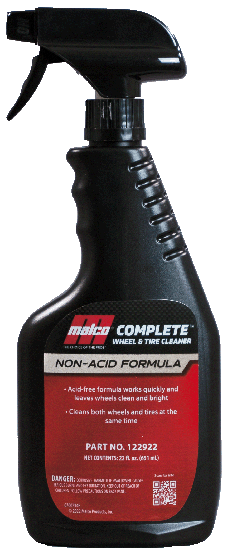 Limpiar las ruedas de un vehículo no tiene por qué ser complicado ni llevar mucho tiempo. La parte más difícil puede ser decidir qué limpiador de ruedas y neumáticos es el mejor para su aplicación. Al limpiar ruedas y neumáticos, primero debe decidir si va a limpiar solo la rueda y luego con un limpiador de neumáticos o si va a limpiar las ruedas y los neumáticos al mismo tiempo. A continuación, siempre debe considerar qué tipo de ruedas va a limpiar. ¿Las ruedas están revestidas de aleación de aluminio, acero, cromo, con revestimiento en polvo o plástico? Una vez que determine el tipo de rueda, querrá seleccionar un limpiador de ruedas y neumáticos aprobado para el tipo de rueda del vehículo. Supongamos que desea tomar la ruta segura. En ese caso, Malco recomienda seleccionar un limpiador de uso general versátil como nuestro limpiador de ruedas y neumáticos sin ácido Complete™, un excelente limpiador listo para usar tanto para ruedas como para neumáticos que es seguro para prácticamente todos los tipos de ruedas y funciona en cinco pasos rápidos.