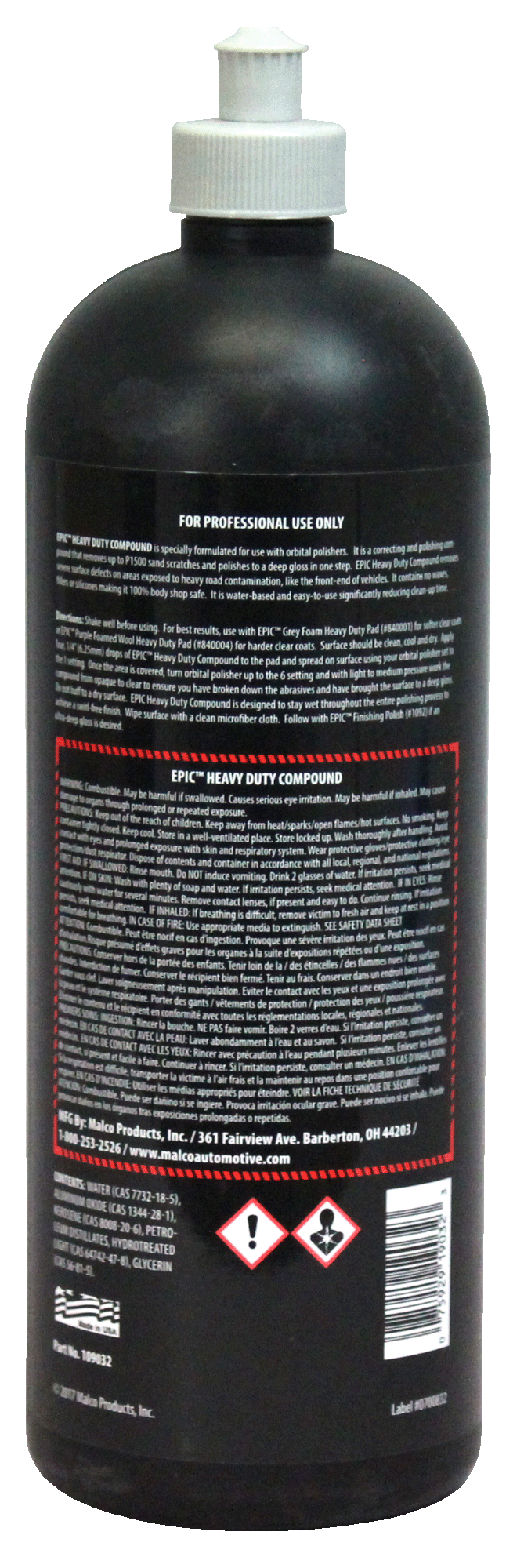 EPIC® Heavy Duty Compound es un compuesto para pulir que elimina hasta 1500 rayones de lijado y pule hasta obtener un hermoso acabado brillante en un solo paso con una pulidora orbital. EPIC Heavy Duty Compound elimina defectos graves de la superficie en áreas expuestas a una fuerte contaminación de la carretera, como la parte delantera de los vehículos. Este compuesto para pulir no contiene ceras, rellenos ni siliconas, por lo que es 100 % seguro para los talleres de carrocería. Además, su fórmula a base de agua y sin polvo reduce significativamente el tiempo de limpieza. Obtenga ese acabado especial en poco tiempo con el sistema completo de corrección de pintura EPIC®.