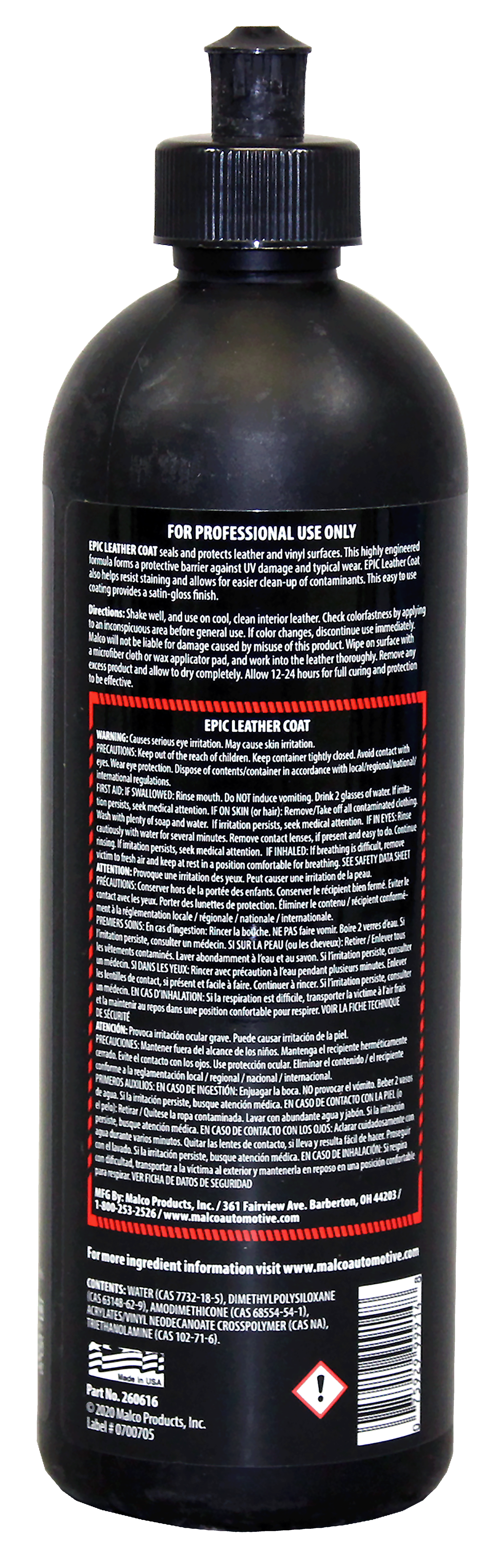 EPIC® Leather Coat es un limpiador y protector especializado para vinilo y cuero que forma una barrera protectora para resistir las manchas, la transferencia de color de la ropa y el daño solar. Este limpiador y protector de cuero versátil se puede usar en automóviles, botes, vehículos recreativos, zapatos e incluso muebles del hogar. EPIC Leather Coat protege el cuero y el vinilo contra derrames de líquidos y permite una limpieza más fácil de la contaminación. La fórmula forma una barrera protectora y produce un acabado satinado.