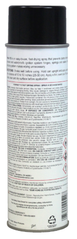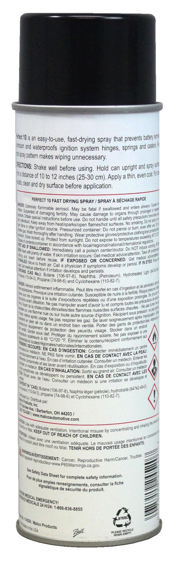 El aerosol de secado rápido Perfect 10™ previene la corrosión de los terminales e impermeabiliza las bisagras, resortes y ruedas del sistema de encendido.