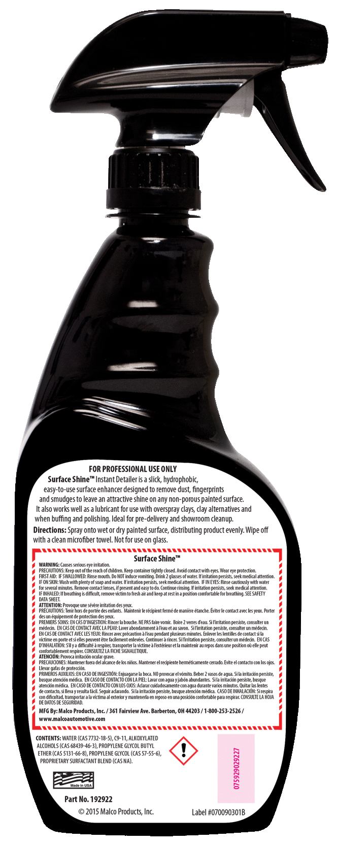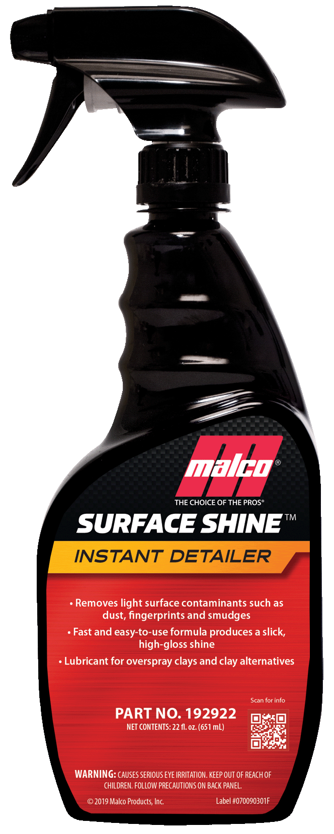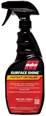 Surface Shine™ Instant Detailer es un potenciador de superficies suave e hidrofóbico, diseñado para funcionar como una cera en aerosol y eliminar el polvo, las huellas dactilares y las manchas de las superficies pintadas no porosas. Este versátil aerosol de cera para autos elimina los contaminantes superficiales ligeros de manera rápida y fácil, dejando un acabado brillante. Surface Shine™ también funciona como lubricante para arcilla y alternativas a la arcilla y se puede pulir o abrillantar sobre la superficie del vehículo, lo que lo hace ideal para la limpieza previa a la entrega y en la sala de exposición.   Pedido bajo demanda.